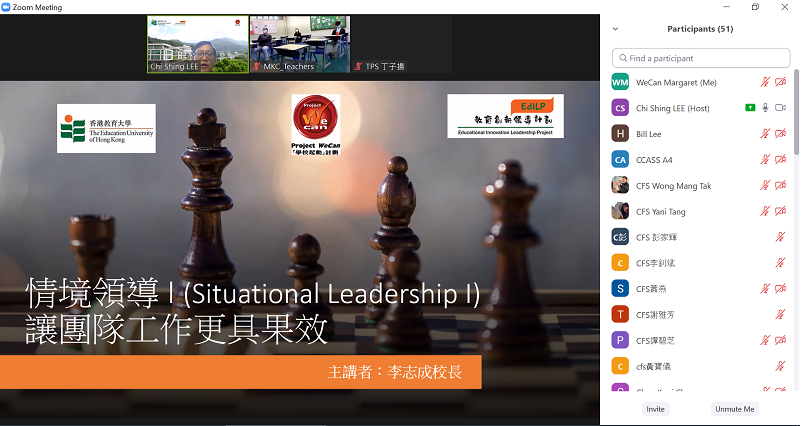 The Educational Innovation Leadership Project (EdILP) of The Education University of Hong Kong continued to provide professional teacher training support to all WeCan schools. Three sessions of leadership development programmes focusing on teaching and administration had been conducted for senior and middle managers between November 2020 and February 2021. Principals and middle management all found the programmes inspiring and practical.