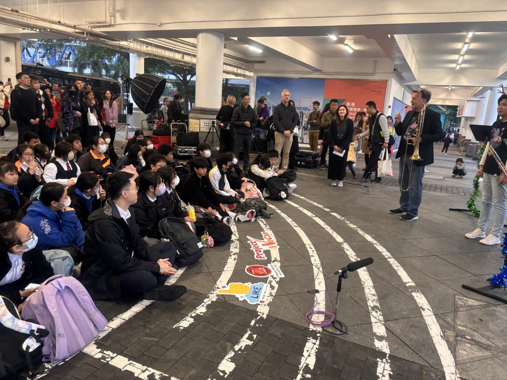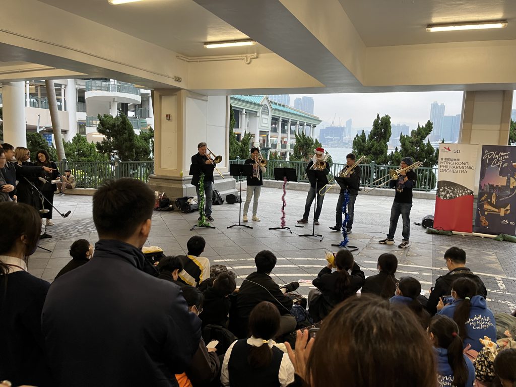 The students embarked on a memorable journey by boarding a specially arranged Star Ferry from Tsim Sha Tsui to Central.  During the ferry ride, students had a chance to hear the beautiful classical music played by the Hong Kong Philharmonic Orchestra (HK Phil), with narrations.  Upon arriving at the Central Star Ferry Pier, students were treated to a delightful community performance with a Christmas theme.  The HK Phil Trombone Quintet introduced and performed various musical pieces, deepening the students’ appreciation for orchestral music.
